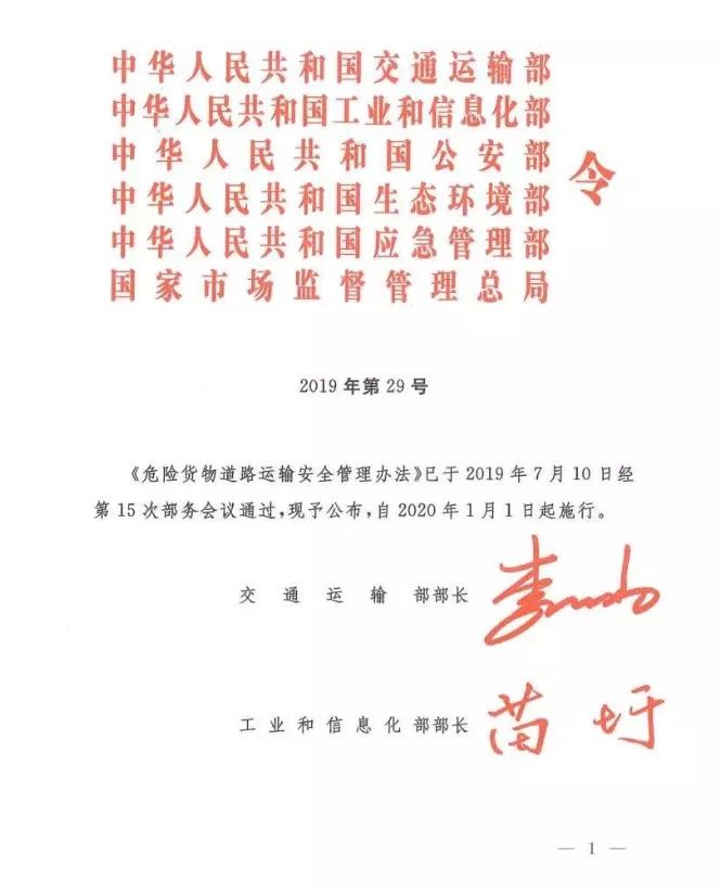 11月25日,交通运输部、工业和信息化部、公安部、生态环境部、应急管理部、市场监督管理总局联合发布了《危险货物道路运输安全管理办法》(交通运输部令2019年第29号,以下简称《办法》),该法规自2020年1月1日起执行。