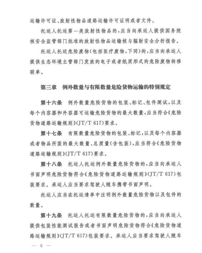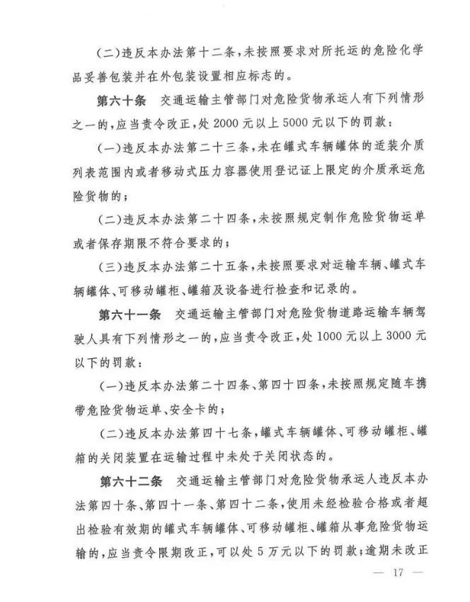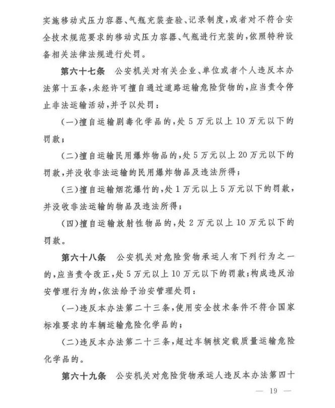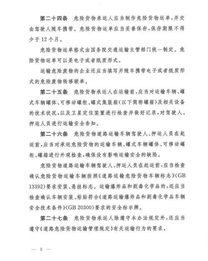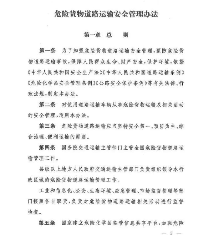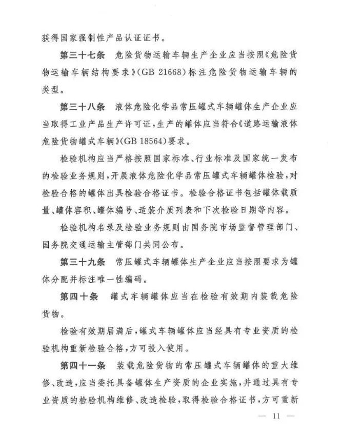 在吸取事故教训、总结各地实践经验、借鉴国际规则的基础上,《办法》对现有危险货物道路运输行业多项制度进行了重大调整和改革,例如:托运清单及运单制度、有限数量及例外数量豁免制度、充装管理制度、常压罐体制造检验制度、车辆承运介质类别管理制度等……